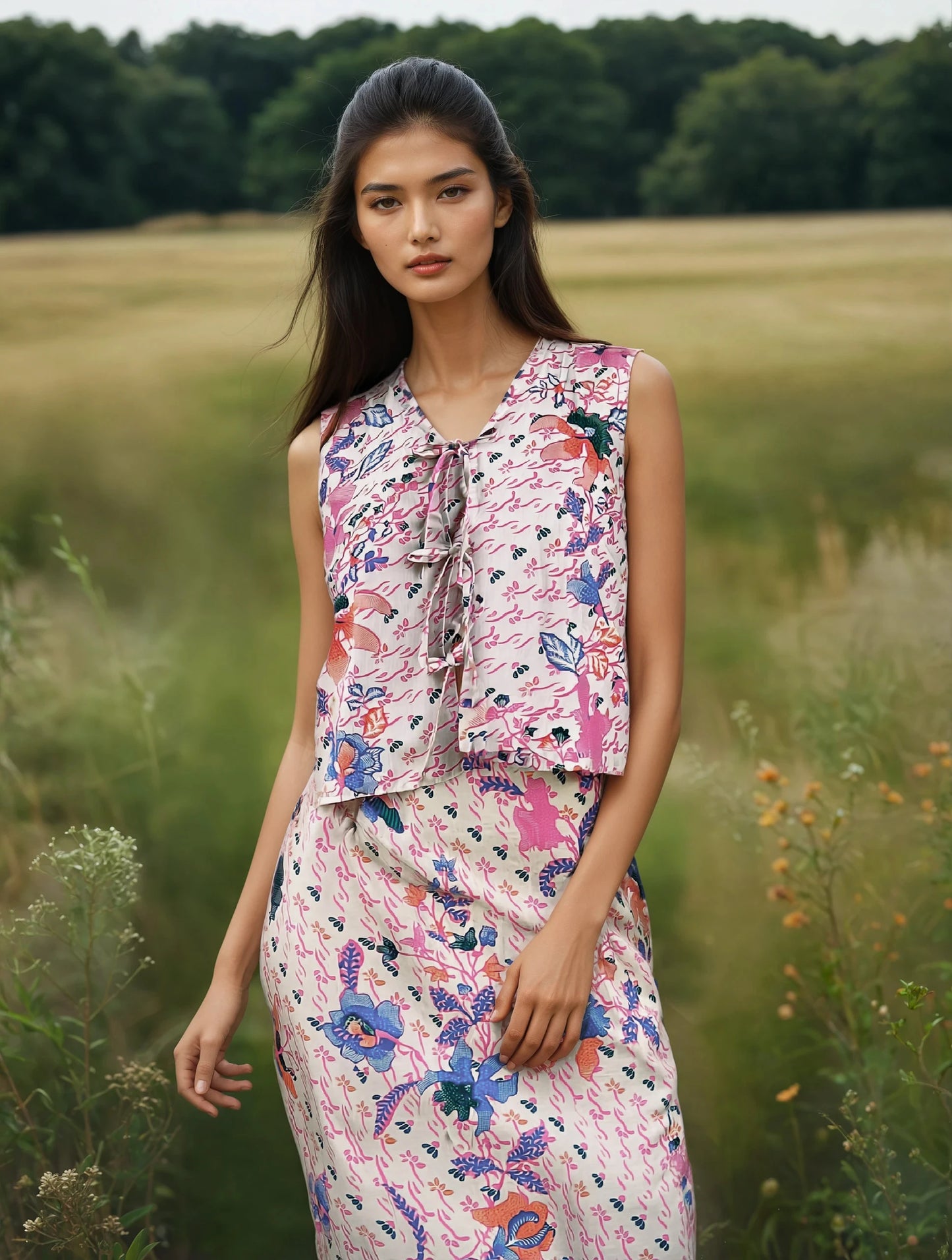 Elevate your wardrobe with our Batik Vest. Made with a self-tie ribbons and adorned in traditional batik print, this vest is the epitome of sophistication and exclusivity. Perfect for special occasions or adding a touch of culture to your everyday look.